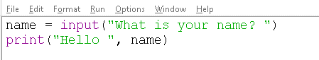In this short, two-line program there is a lot happening. Let’s talk through it. The first thing that happens is that there is a variable “name” create. This is assigned to anything that the user will answer when asked the question “What is your name?”. The input() command is used to ask the question. The print() command then says “Hello” followed by the information that is stored inside the variable name. Notice that the word “Hello” is in speech marks, followed by a comma and then the variable name is not in speech marks. This tells the program to say the value held inside the variable name, not the word “name”. When using IDLE you will see that everything inside speech marks (between the two sets) is colours green, the commands input and print are both coloured purple and everything else is coloured black. These are the default colours for text, commands and variables (if you want to, you can change these colours in the options-> configure IDLE ->Highlights tab).