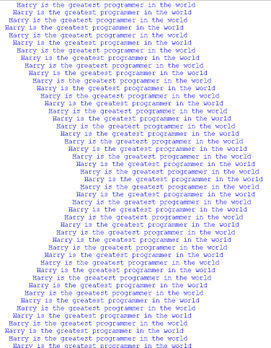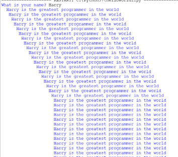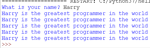 Make a change to your program so that it also says that name is the greatest programmer in the world! Can you make your program say this five times? Your output should now look like this: