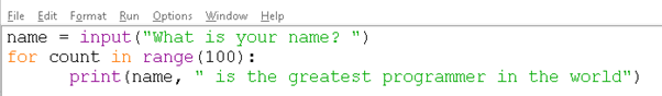 If we want the program to do the same thing again, to repeat something that it needs to do more than once we can make a loop. There are two types of loops, one that loops for the number of times that we need it to (called a count controlled loop of for loop) and one that will loop while a condition is true (called a condition controlled or while loop). Other programming languages have other types of loops but these are the two types in Python 3, the language we are learning today. Let’s print out our sentence name, “is the greatest programmer in the world”, 100 times. For this, we know how many times we want to loop - one hundred - so we will use a for loop.