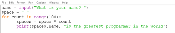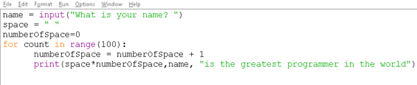 | 7 | Print(space* numberOfSpaces, name, “is the greatest) |